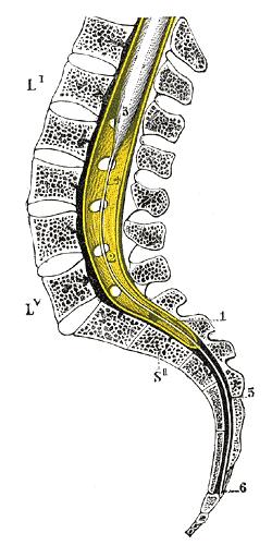 Cette image vous montre ce lien entre les méninge en jaune et le coccyx. Les méninges (en jaune) sont reliés au coccyx par le filum terminae qui peut se traduire par extrémité du fil.