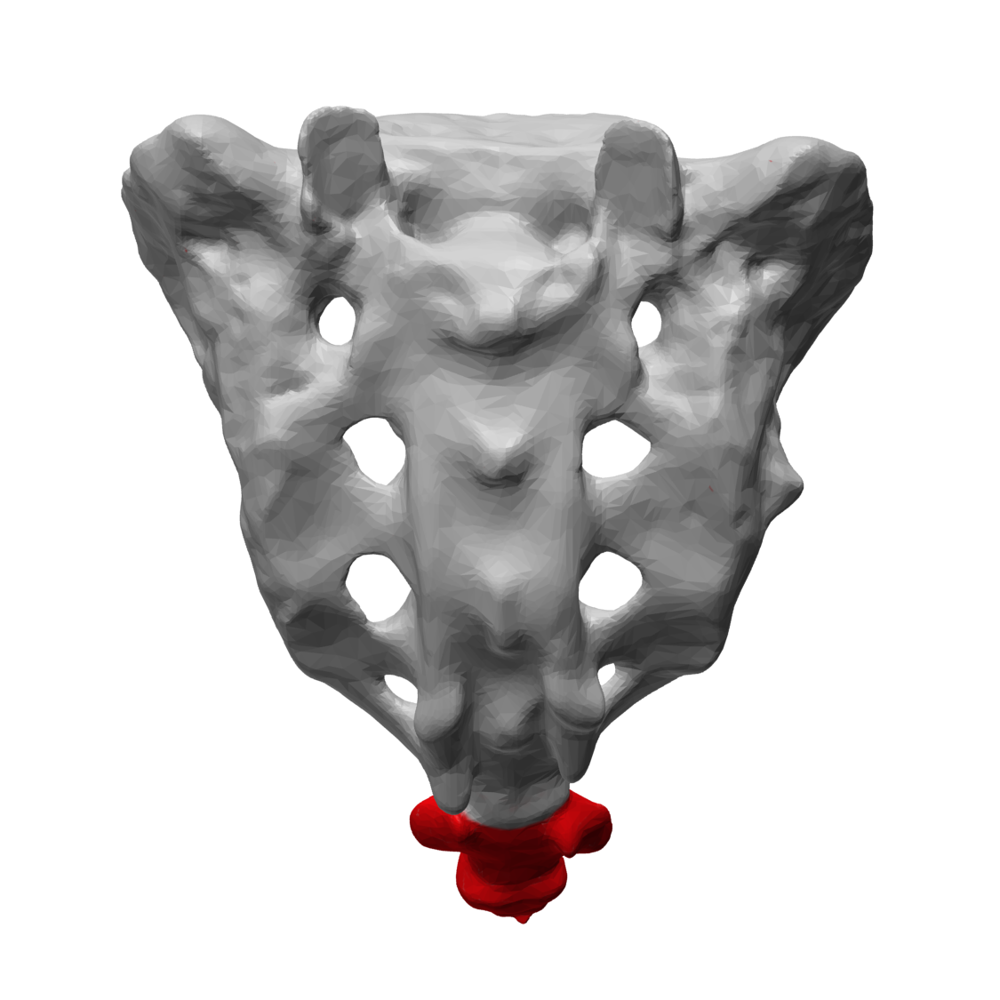 Sur cette image vous pouvez voir cette articulation sacro-coccygienne (entre le sacrum et le coccyx) avec le coccyx en rouge.