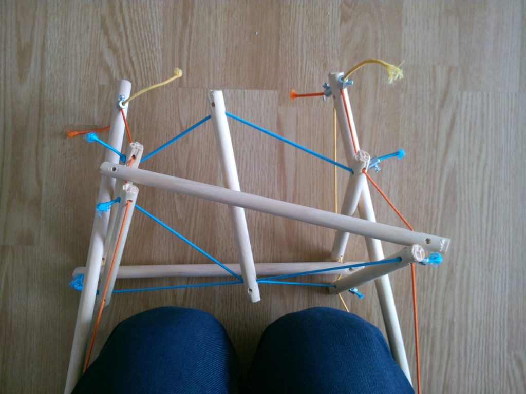 Une fois les deux élastiques mis en place, équilibrez la structure en jouant avec les tenseurs. La structure devrait être assez symétrique. Il faut que les élastique soient tendus mais pas à leur limite !