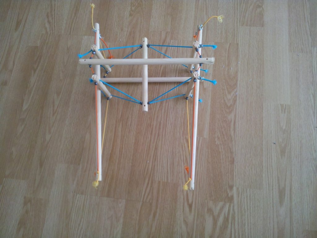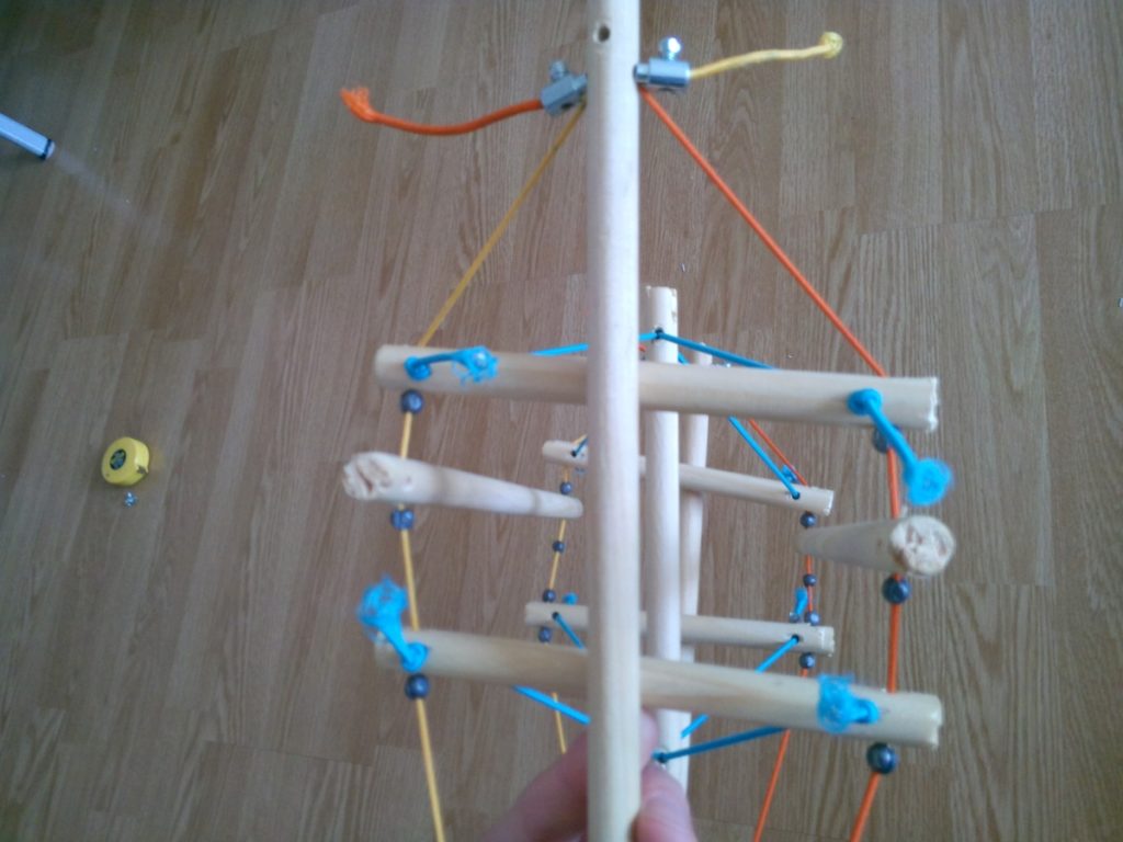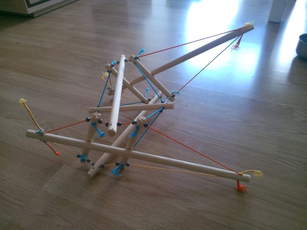 petit aparté: Je ne pense pas que la structure que nous allons réalisée2 soit entièrement en tenségrité. En effet vous pouvez remarquer qu’à certains endroits deux éléments bois se touchent. La résistance des deux structures est donc mise en jeu.