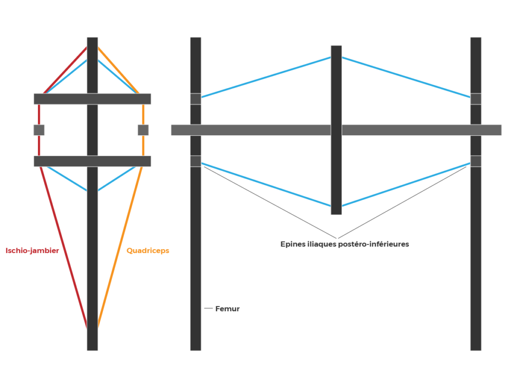 Il faut savoir que ce n’est absolument pas anatomiquement exacte. Mais, nous pouvons retrouver dans cette structure certains repères osseux et muscles dont les épines iliaques antérieures et postérieures, le m.quadriceps et le biceps fémoral.