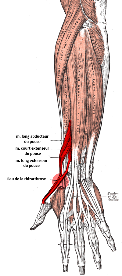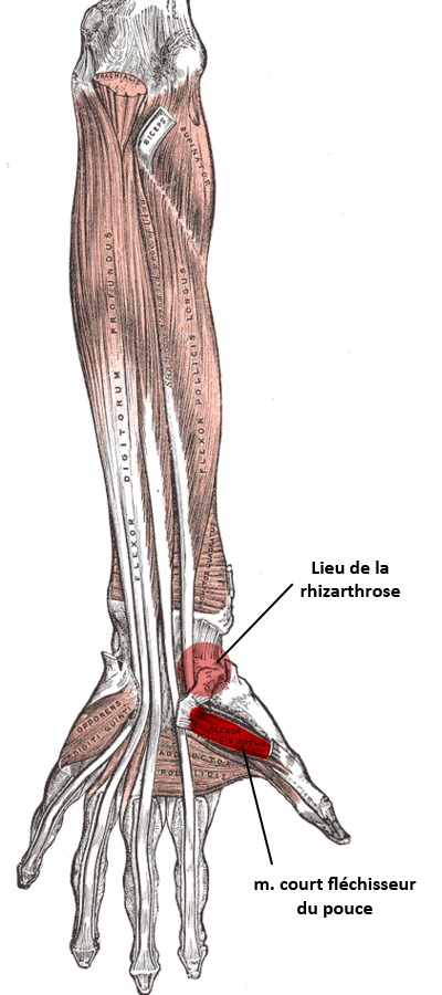 Ils sont plusieurs mais majoritairement il s’agit des muscles vous permettant de réaliser la pince pouce/index et l’extension du pouce (l’autostoppeur). Dans le cas d’arthrose ces muscles sont particulièrement sensible preuve d’une activité trop importante. Voici ces muscles sur planche anatomique surlignés en rouge.