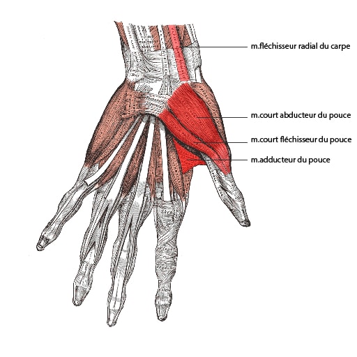 Lors de mes consultations, j’ai observé une grande sensibilité de la tabatière anatomique, la zone à la base du pouce mais aussi des muscles de l’éminence thénar. L’éminence thénar est une zone très musculaire où se trouvent les muscles abducteurs du pouce, fléchisseurs du pouce, opposant du pouce et également en profondeur, l’adducteur du pouce.